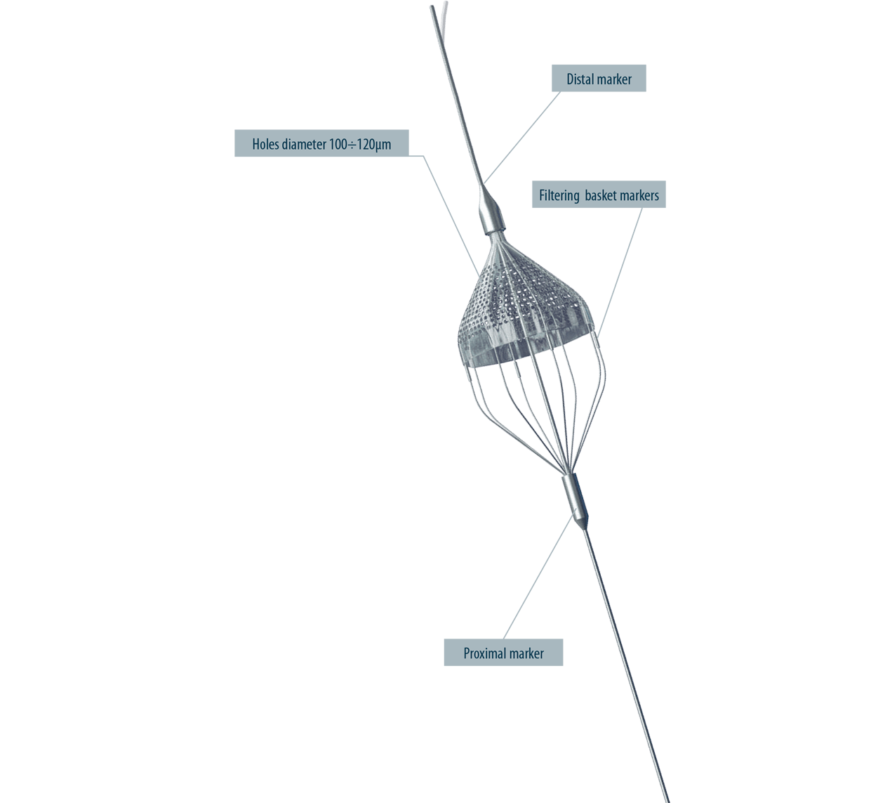 - Filtering basket made of biocompatible materials based on 8 nitinol arms with permanently fixed polyurethane filter.